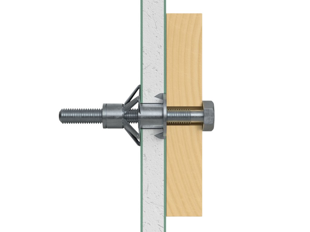 Ocelová hmoždinka pro upevňování do dutých materiálů. Montáž pomocí šroubováku nebo montážních kleští. Díky zoubkům na límci hmoždinky se při montáži neprotáčí.
