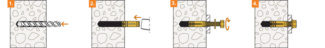 - Při zašroubovávání metrického šroubu se mosazná hmoždinka rozpírá v přední části a kotví spolehlivě do podkladu.
