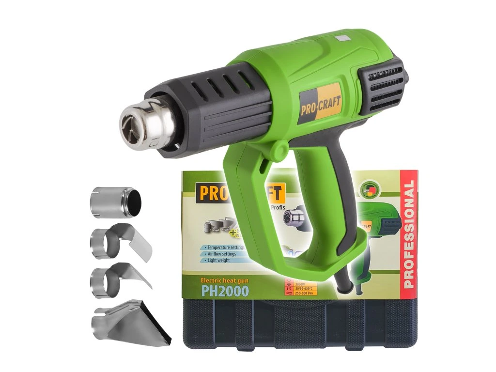 Horkovzdušná pistole Procraft PH2000 je určena k odstranění barev, laku, fólií, k sušení nových vrstev, k tvarování a ohýbání plastů. Regulace teploty v rozsahu 50-600°C a průtoku vzduchu