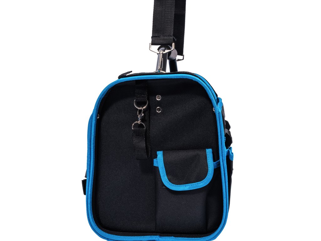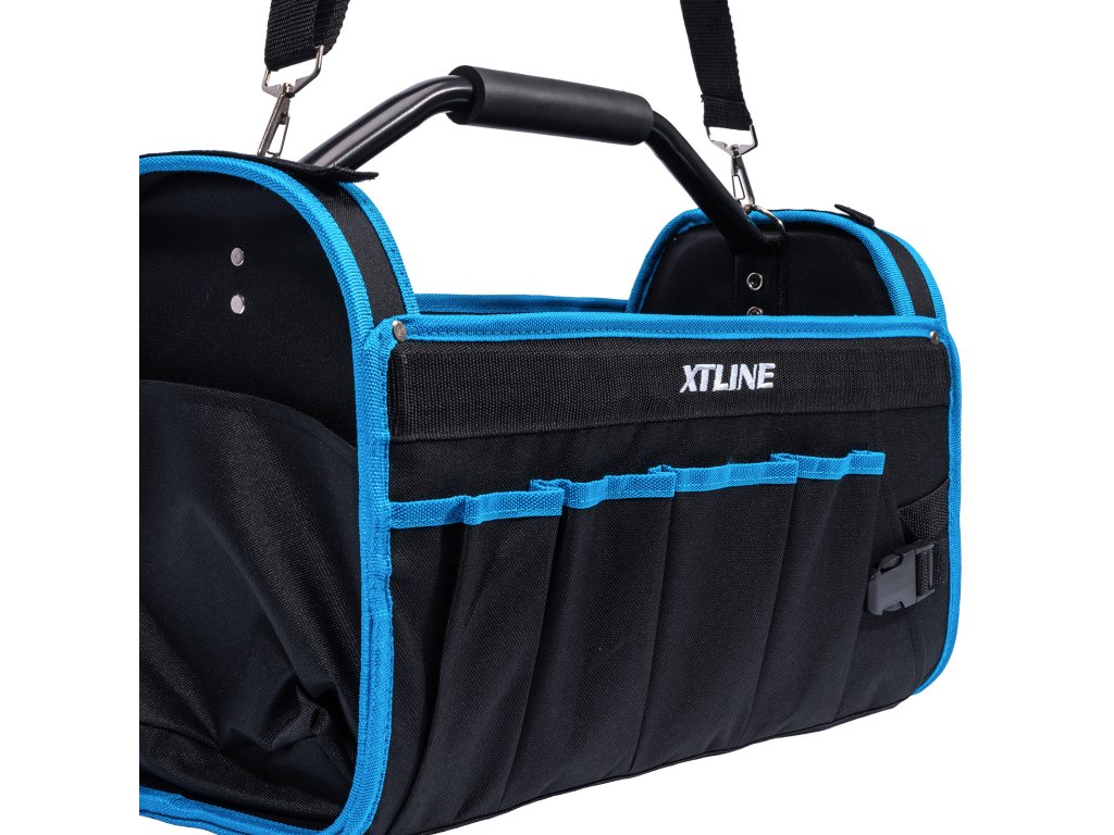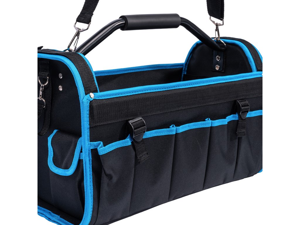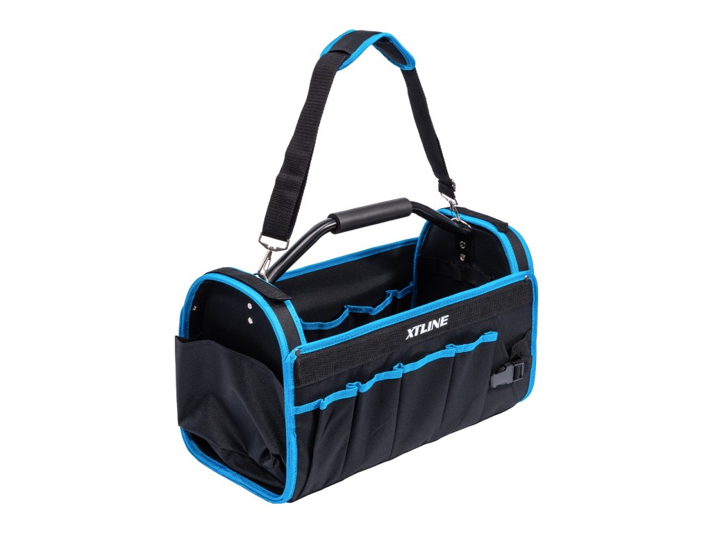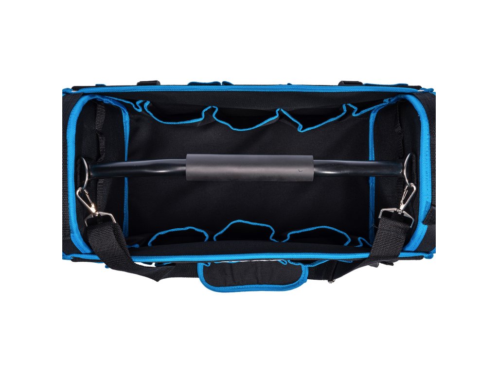 Nylonová taška ná nářadí obsahuje 31 kapes a 8 držáků na bity. Kovová rukojeť umožňuje snadný přenos. Maximální nosnost tašky činí 15 kg. Kromě kovové rukojeti je možné využit pás přes rameno, který je součástí balení.