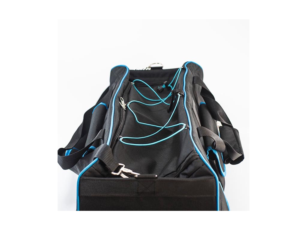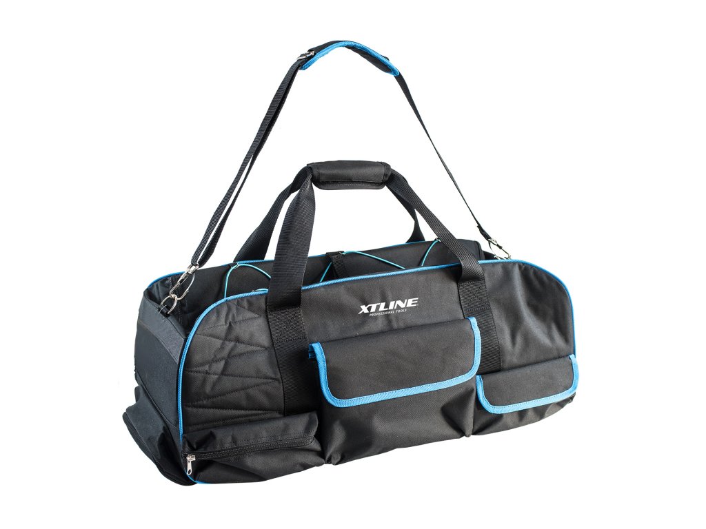 Nylonová taška na nářadí je vhodná pro přepravu a skladování větších sad elektro nářadí. Obsahuje 13 vypolstrovaných kapes, uvnitř i venku. Taška je vybavena dvěma pojízdnými kolečky a teleskopickým kovovým madlem pro snadnější převoz. Součástí balení je i pás přes rameno.