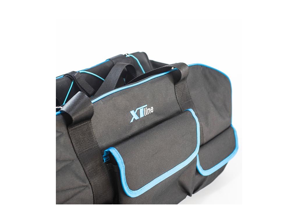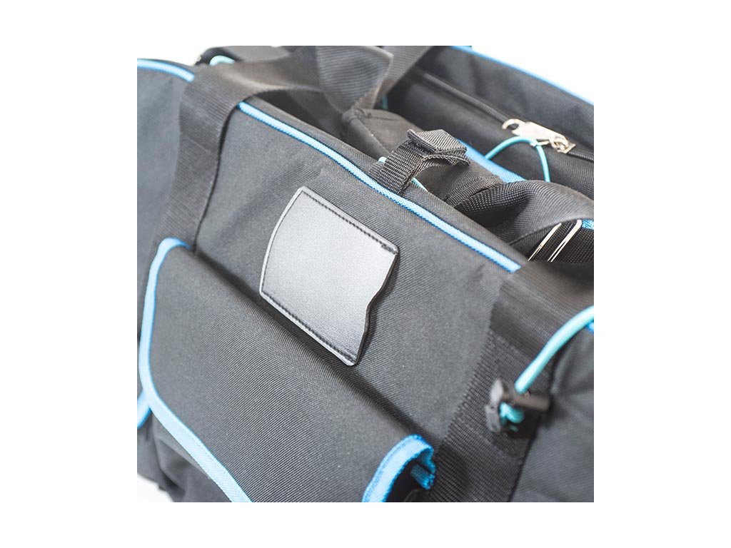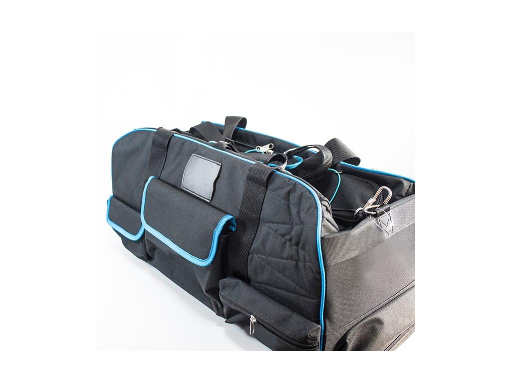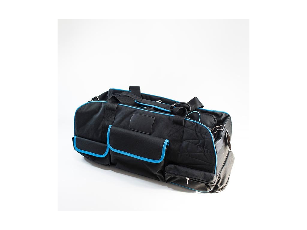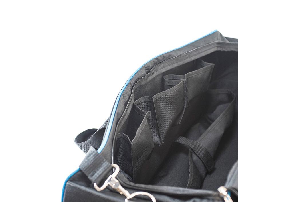 Nylonová taška na nářadí je vhodná pro přepravu a skladování větších sad elektro nářadí. Obsahuje 13 vypolstrovaných kapes, uvnitř i venku. Taška je vybavena dvěma pojízdnými kolečky a teleskopickým kovovým madlem pro snadnější převoz. Součástí balení je i pás přes rameno.