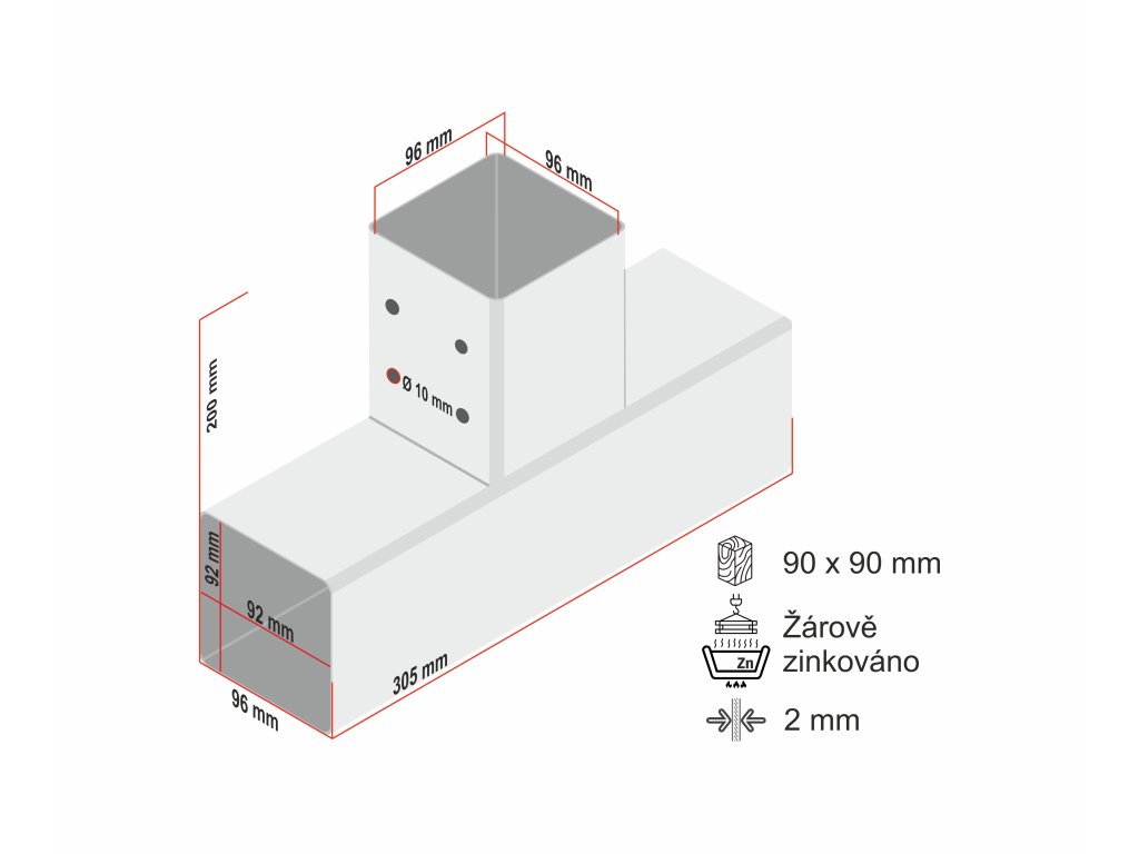 Trámová spojka pro trámy 90x90 mm, typ T Postavte pergolu, altánek, přístřešek nebo konstrukci pro dětskou houpačku s pomocí konstrukčních trámových spojek CONNEX. Vyrobeno z kvalitní žárově pozinkované oceli. Žárové zinkování zajišťuje odolnost proti povětrnostním vlivům a je vhodné k nabarvení či lakování. Materiál: žárově zinkovaný ocelový plech Uchycení: otvory 10 mm, doporučené vruty: ø8x50 mm Rozměry: 91 x 305 x 200 mm