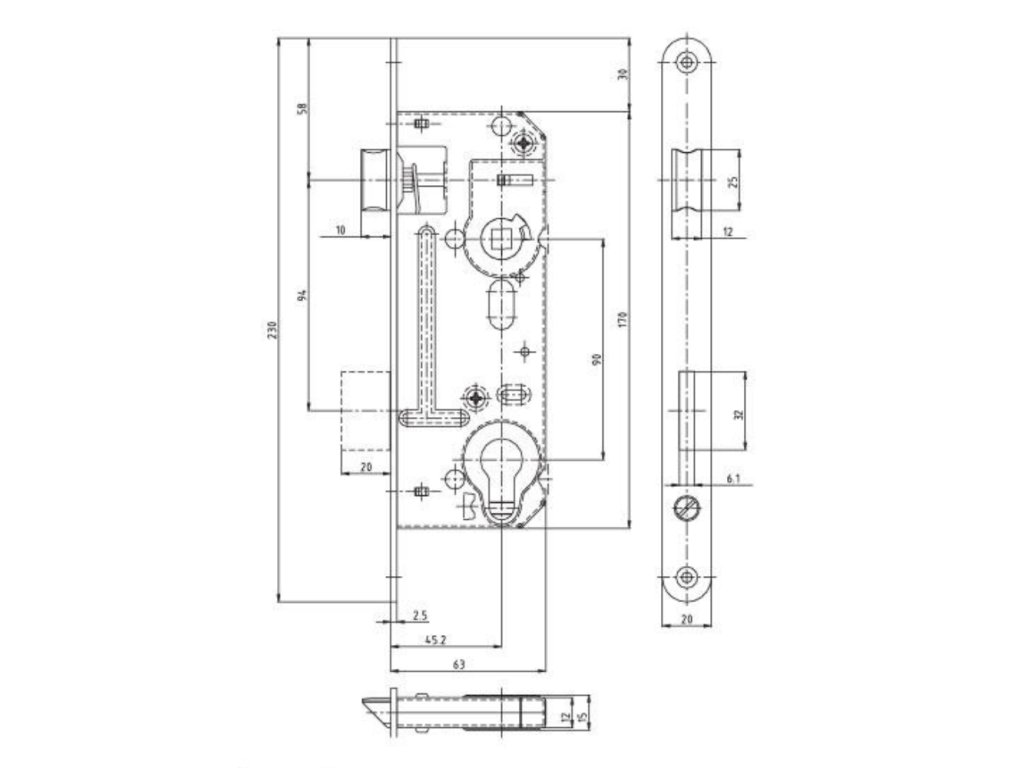 Zámek zadlabací 02-06 P-L 63/90 vložkový čelo 20 osová vzdálenost 45mm Hobes